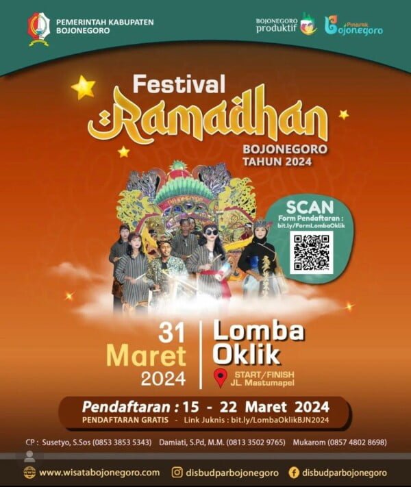 Bojonegoro – Kabupaten Bojonegoro bersiap untuk menyelenggarakan Lomba Oklik sebagai bagian dari upaya mempertahankan warisan budaya lokal dan menyemarakkan Bulan Suci Ramadhan 1445 Hijriah. Kegiatan ini diselenggarakan oleh Dinas Kebudayaan dan Pariwisata (Disbudpar) dan akan berlangsung pada Minggu, 31 Maret 2024.
