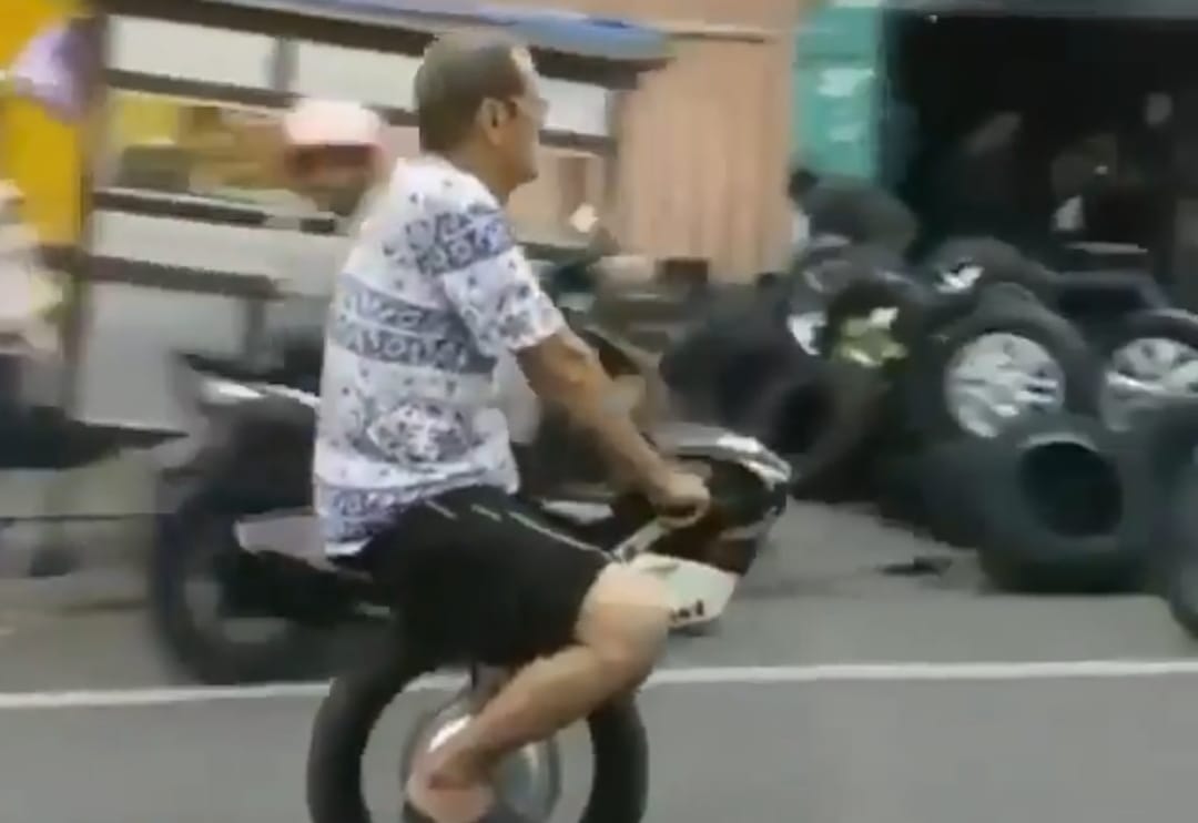 Terlihat pria yang mengendarainya begitu santai dan terlihat sudah ahli dalam mengendarai motor beroda satu tersebut.