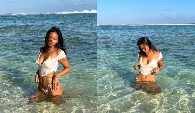 5. Tampak saat menikmati basah-basahan dipantai, pesonanya sukses bikin netizen salfok